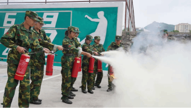 图为新生们开展灭火器实操演练