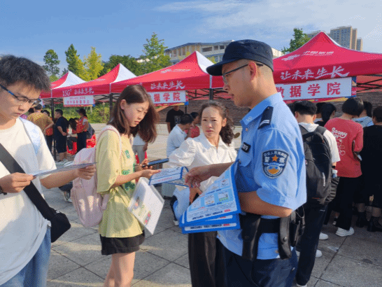 驻校警务助理在迎新现场为师生发放国家安全、反间谍防诈骗宣传单