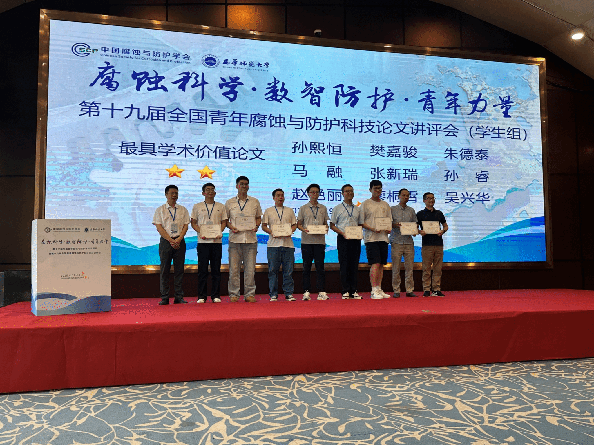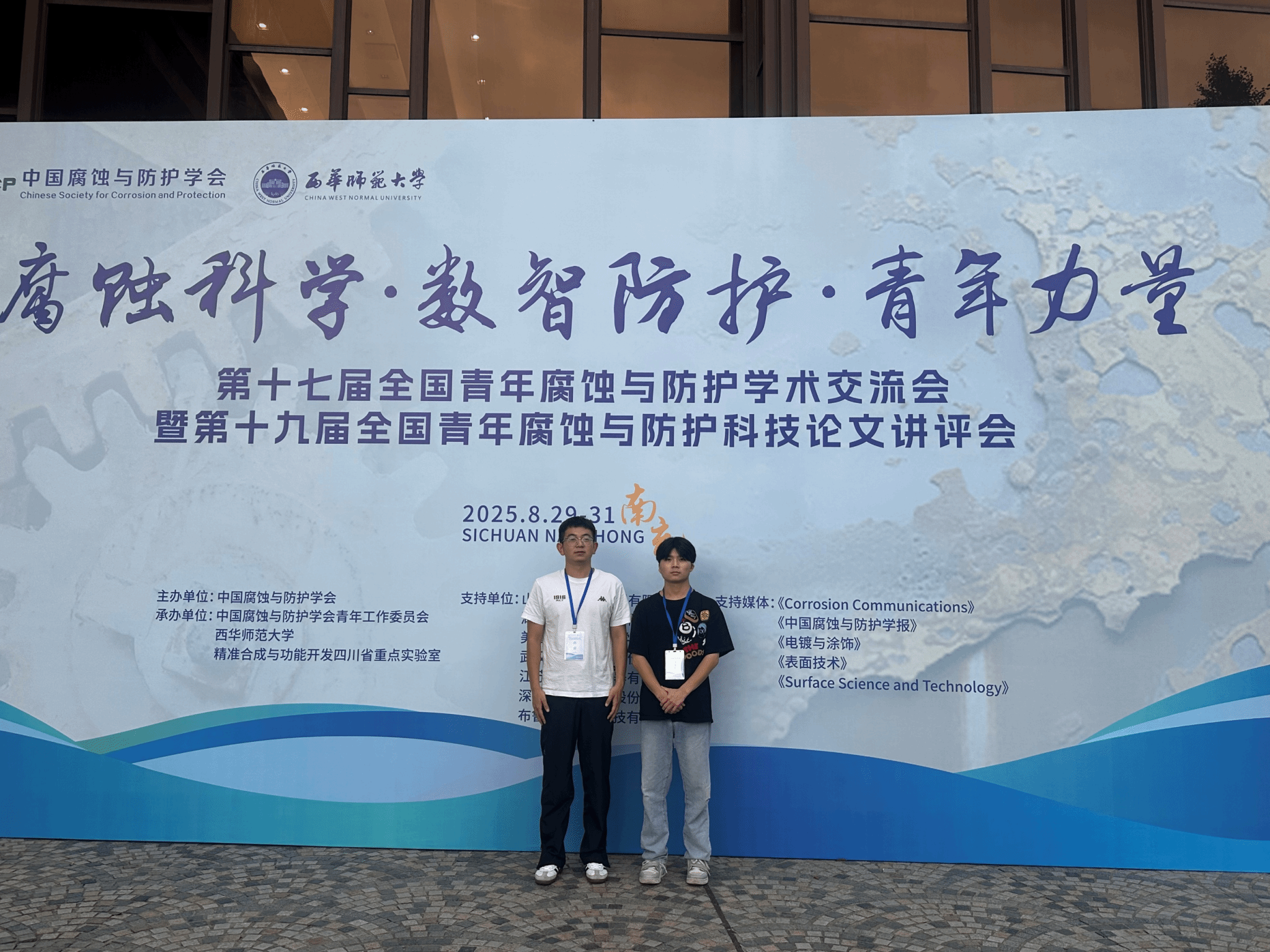2025年8月29日至31日,第十七届全国青年腐蚀与防护学术交流会暨第十九届全国青年腐蚀与防护科技论文讲评会在四川省南充市举行。本次会议由中国腐蚀与防护学会主办,中国腐蚀与防护学会青年工作委员会、西华师范大学以及精准合成与功能开发四川省重点实验室联合承办。我院2023级材料与化工专业硕士研究生孙睿同学及2023级材料科学与工程专业本科生文旭松同学参加了此次会议。