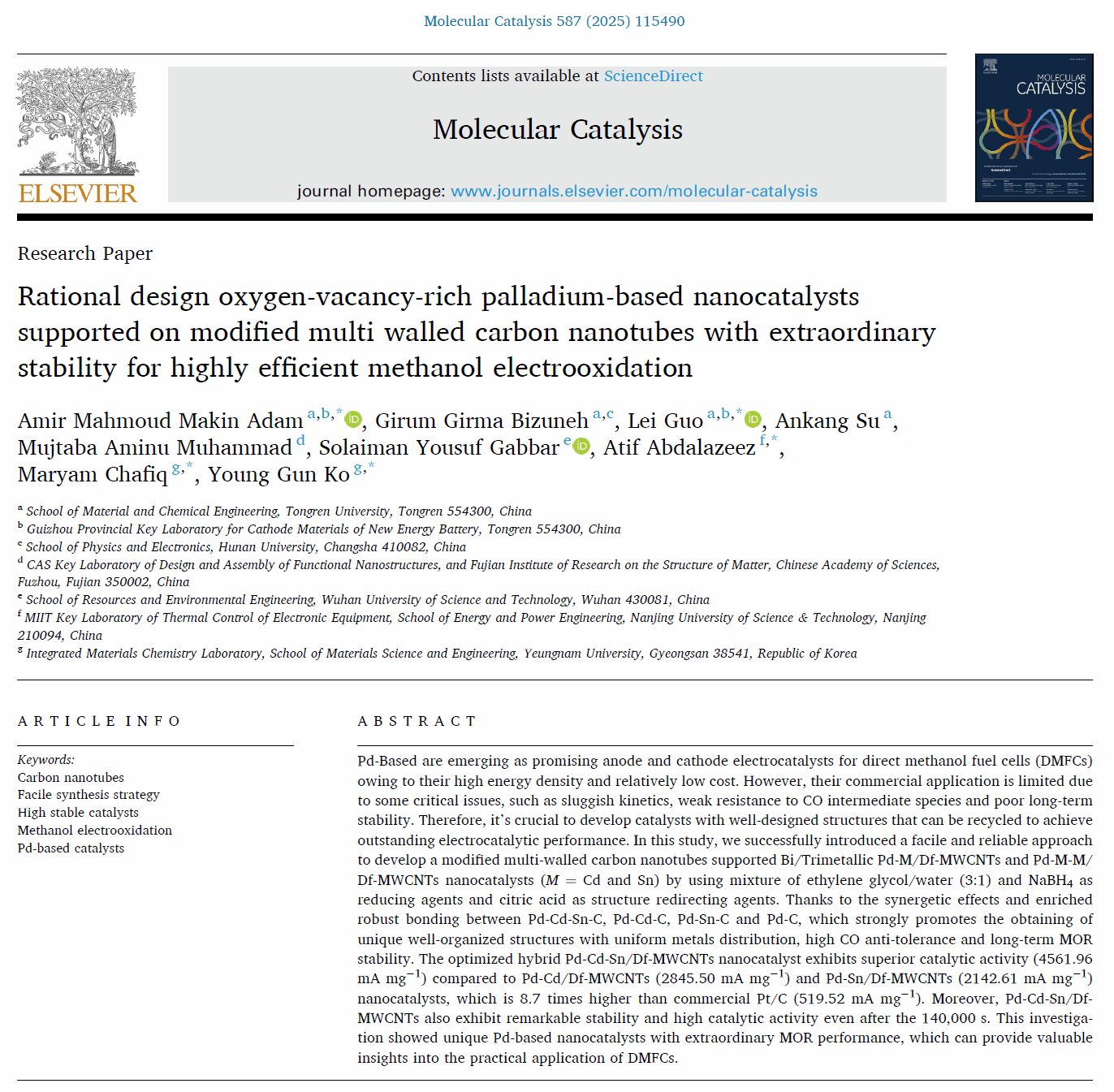 近日,催化领域知名期刊《Molecular Catalysis》发表了我院材料电化学与表界面工程课题组的最新研究成果,论文题目为“Rational design of oxygen-vacancy-rich palladium-based nanocatalysts supported on modified multi-walled carbon nanotubes with extraordinary stability for highly efficient methanol electrooxidation”。该研究以beat365中国唯一官网作为第一完成单位,我院外籍教师Amir Mahmoud Makin Adam为论文第一作者。《Molecular Catalysis》是催化科学领域的国际权威期刊,最新影响因子为4.9。