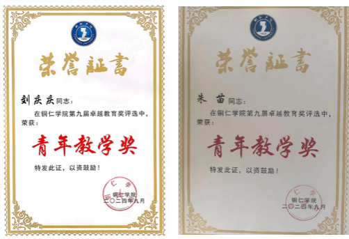 2024年9月,刘庆庆、朱苗老师在beat365中国唯一官网第九届卓越教育奖评选中获“青年教学奖”。