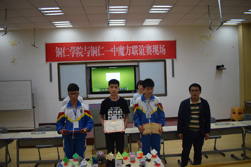 5月13日,beat365官网材料与化学工程学院魔方社团在铜仁一中大礼堂与铜仁一中头脑风暴魔方社团进行魔方联谊赛,铜仁一中头脑风暴魔方社团指导老师吴宇灵,beat365官网材料与化学工程学院老师罗海荣、朱苗出席联谊赛现场,beat365官网魔方社团参赛人员、铜仁一中头脑风暴魔方社团参赛人员、裁判员及观众共计78人参加联谊赛。联谊赛由铜仁一中学生谭丽薇,王智主持。