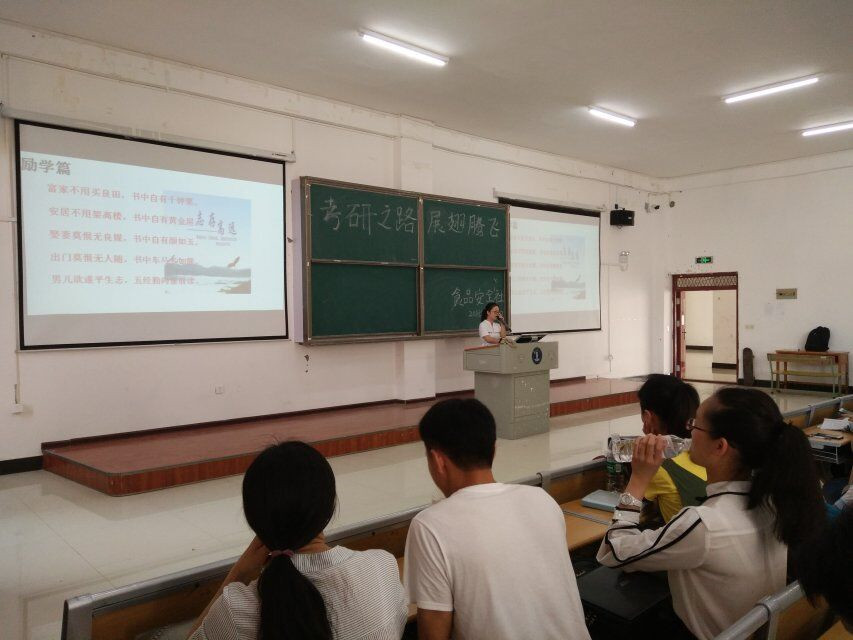 5月19日下午15:00—17:00,我院食品安全社在博思楼102教室举行以“考研之路,展翅腾飞”为主题的讲座,14级食品科学与工程专业考研的5位学子主讲,全校师生共350余人聆听此次讲座,讲座由食品安全社成员粟照科主持。