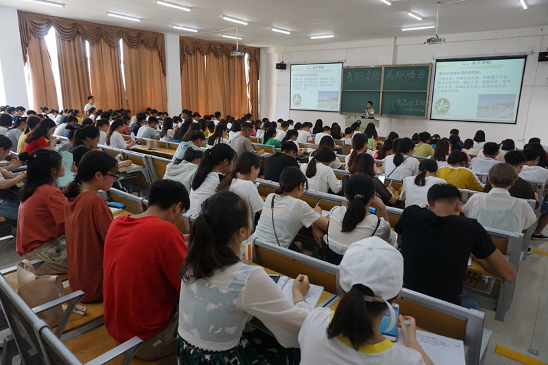 讲座上,何坤明、石秋月、韦林保、杨娟、吴慧琳分别从专业学习、食品科学与工程专业的学校排名、考研国家线、英语四六级、考研资料的收集等方面分享了他们的考研心得。何坤明说,考研的路上,走好自己的路,不要停,也别急。接着,石秋月说,在考研中,选择适合自己的学校和所考的专业很重要,其次是要找到属于自己的学习方法,然后要有和你分享资源的研友,最后就是要努力。在说到专业的选择时,杨娟谈到,要认真分析专业发展前景,冷静平析个人能力,要有兴趣爱好,她希望在场的同学们只有选择了自己立志研究的方向,从近处着眼来看,考生才能将在漫长的复习过程中坚持到底;从远处来说,才能叫未来的研究领域或事业上有所突破。在谈到考研的必备条件时,韦林保说,要养成良好的习惯,生活要有规律,有针对性的采取有效措施,提高复习率,他强调,要不忘初心,继续前行。随后,吴慧琳强调,离开学校之后,走得再远,不要忘本,不要忘记自己从哪里来,生活中要学会担当,学会坚强。随后,现场进行了互动。