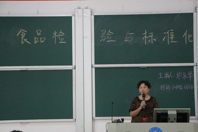 讲座上,帅永华就食品检验与标准化知识进行了详细的讲解,她从“食品检验的内容”“食品检验的方法”“食品检验计量、标准基础知识”三个方面进行了阐述。在说到食品检验的内容时,她说,营养成分检验、添加剂检验、有害物检验是食品检验的主要任务,简单的说,就是按照制定的标准,对食品原料、辅助材料、半成品及成品的质量进行检验,然后对食品质量进行评价,对开发新的食品资源,试制新的优质产品,改革生产工艺等提供依据和方法建议。在谈到食品检验的方法时,他向同学们介绍了食品检验的一般方法,国家标准方法,并用图表述了食品分析方法,在谈到食品检验计量、标准基础知识时,她解释了标准与标准化的定义,她强调,标准宜以科学技术和经验的综合成果为基础,以促进最佳的共同效益为目的,她指出,标准化与标准的区别,标准是规范性文件,标准化指的是制定标准、实施标准的一系列活动,随后,她向同学们详细介绍了食品标准化的分类、怎样编写食品标准的代号和编号、编写标准的基本原则以及法定计量单位。