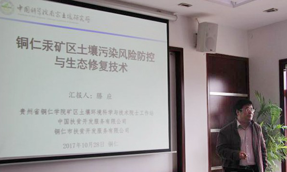 会上,滕应作了关于铜仁汞矿区土壤污染风险防控与生态修复技术的汇报。他从国家和地方绿色发展的战略要求、铜仁市汞矿区环境污染状况、土壤污染综合防治先行区的四个工作、土壤修复的指导思想是人与自然和谐发展、具体的技术路线五个大方面讲述土壤污染问题,重点讲述了关于治理与修复方面的工作,指出了芦竹对土壤有修复价值,提出可以从生态修复产业链、全自动芦竹板材生产线、芦竹(秸秆)压阻燃板材全产业链项目对芦竹进行土壤修复,结合“国家和中国科学院科技成果转移转化行动”战略落实,打通技术链、完善产业链。