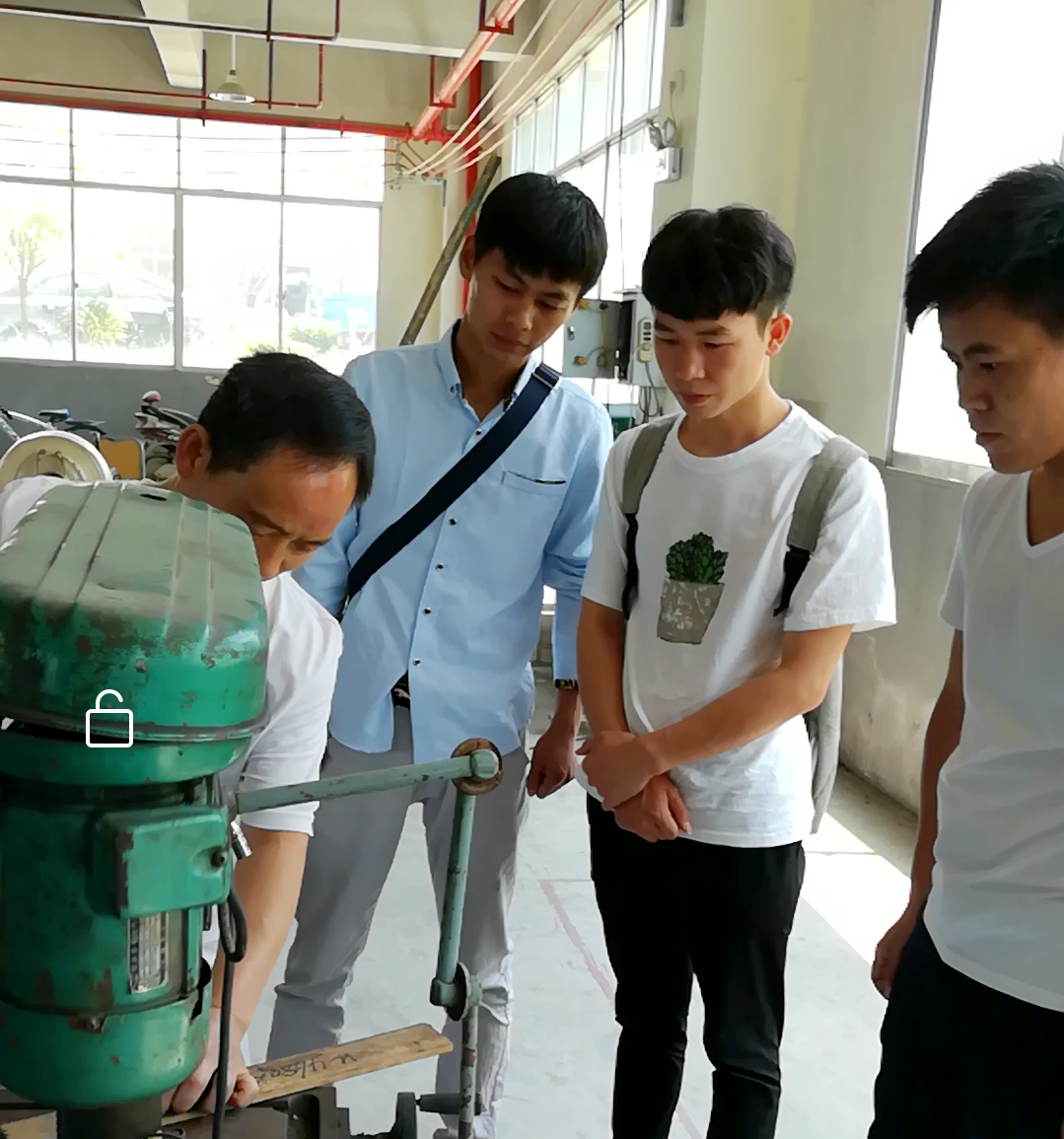 毕文勇、杜和萍和张文学三位同学与贵州宏安制动器科技有限公司刘师傅在车间对刹车片进行加工