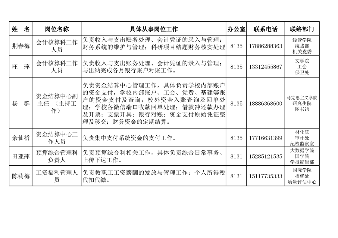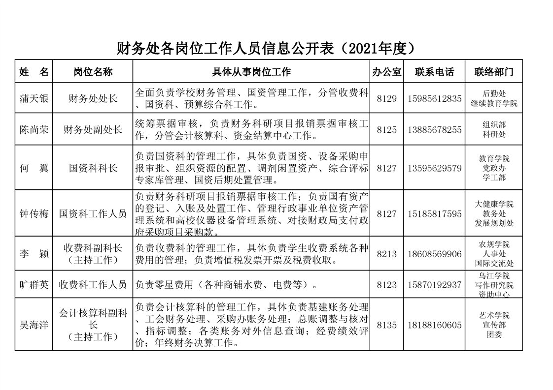 财务处各岗位工作人员信息公开表