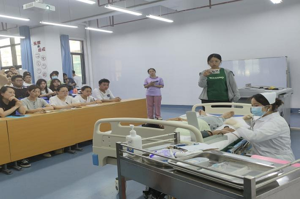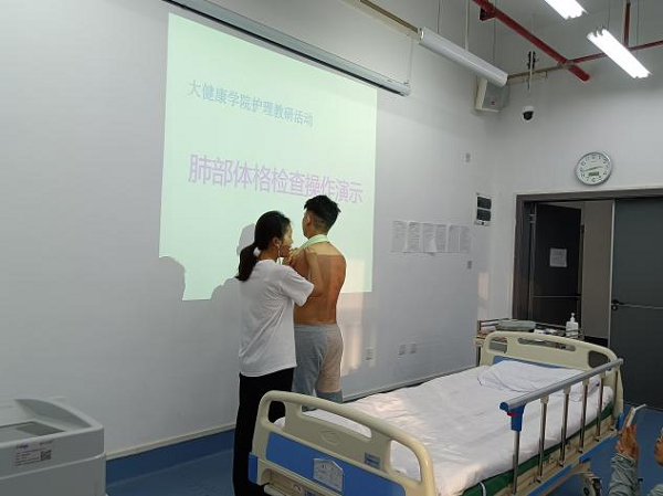为了更好地提升学生的临床护理技能水平,增长其技能比赛的竞赛经验,大健康学院护理教研室邀请曾在广州中山大学附属第三医院岭南医院实习并在该院护理技能大赛获奖的19级护理毕业班学生于5月29日下午六点,在实训楼四楼阶梯教室开展“肺部体格检查操作演示”。本次操作演示者为参赛获得一等奖的吴迪同学及其队友杨兰兰、唐艳玲、陈城等,“病人”由19级的陈泽望同学扮演。出席此次教研活动的有护理教研室的印双红、田芬、易彩霞、王睿智、孙馨、李寅翠、刘娴等老师,以及护理健康系2021级、2020级、2019级的全体同学。