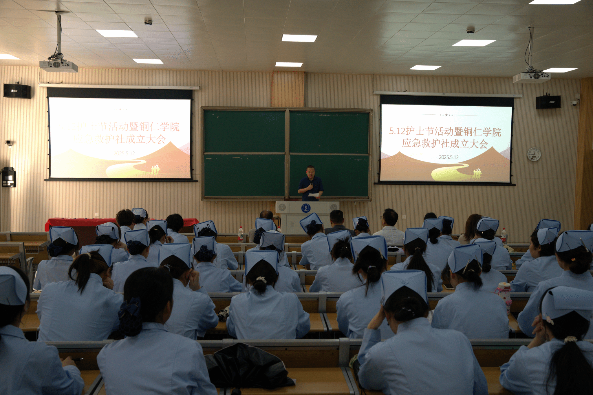 5月12日上午,在第114个国际护士节来临之际,大健康学院于博思楼103举行以“传承南丁格尔精神,用爱点亮生命之光”为主题的“5·12”国际护士节暨beat365中国唯一官网应急救护社成立大会庆祝活动,大健康学院党委书记吴承品、院长余静、副院长徐路及护理健康系全体师生参加大会。