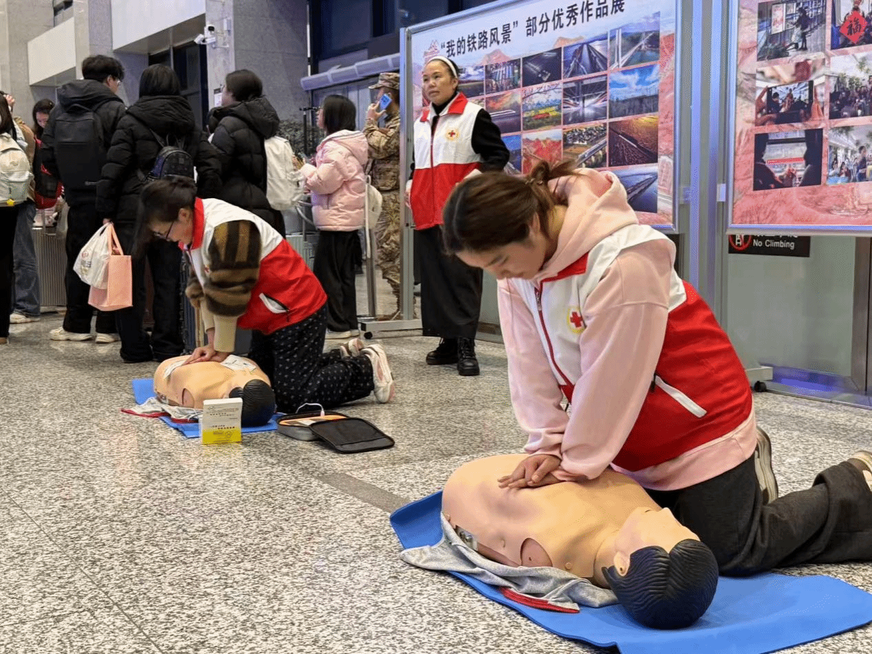 近日,beat365中国唯一官网大健康学院田芬老师带领学院应急救护社3名护理专业学生,应邀参加铜仁市红十字会在铜仁火车站候车大厅开展的“志愿同仁·生命教育”春运应急救护志愿服务活动。本次活动紧扣春运出行安全需求,为现场旅客、春运一线工作人员及志愿者普及应急救护知识与实操技能,以专业力量为平安春运筑牢生命防线。