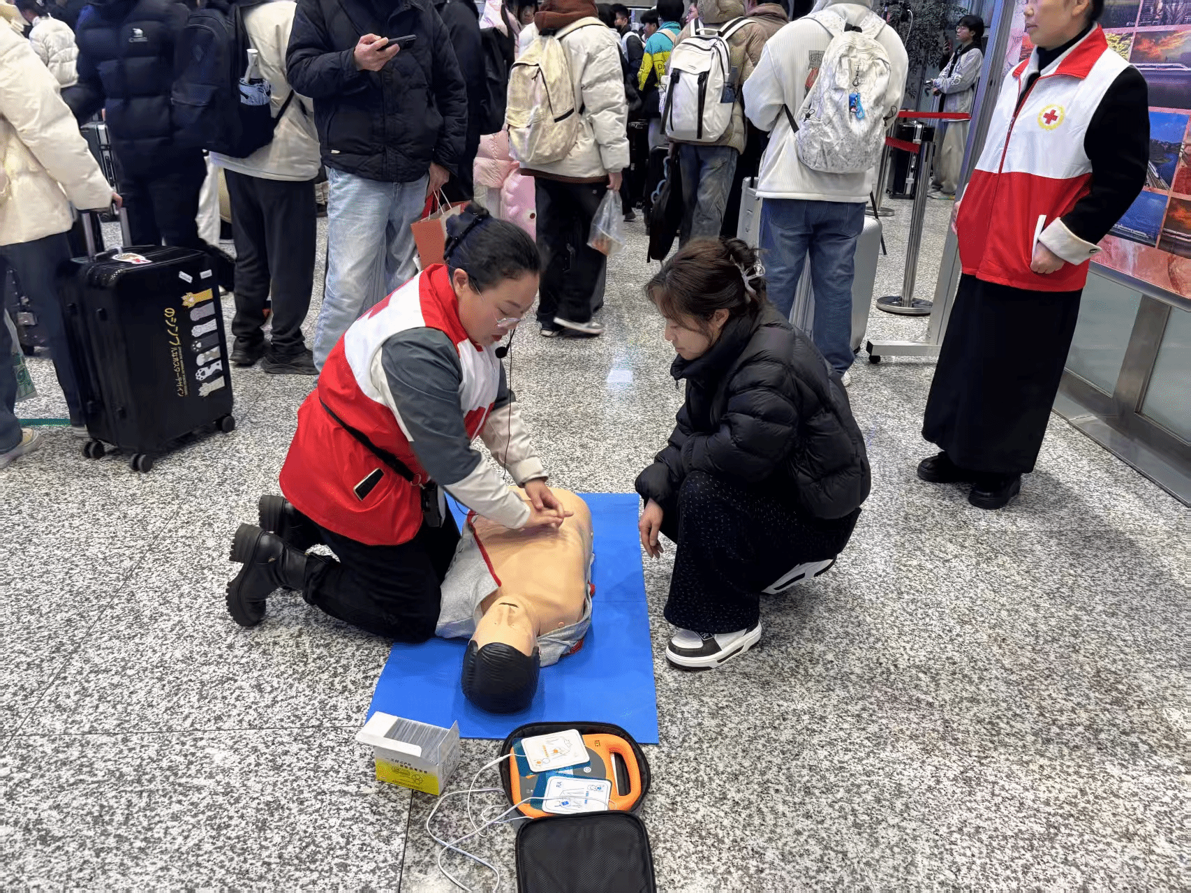 活动现场,师生志愿团队结合春运人员密集、突发状况多的特点,围绕心肺复苏(CPR)、自动体外除颤仪(AED)操作、海姆立克急救法三大核心内容开展教学。老师从急救原则、操作要点入手细致讲解,学生志愿者则以心肺复苏模型为教具,完整演示心肺复苏全流程,将意识判断、紧急呼救、胸外按压、开放气道、人工呼吸等每一步规范动作清晰呈现,同时针对按压深度、频率等关键细节反复示范,拆解实操中易出现的误区,让现场群众快速理解核心要领。