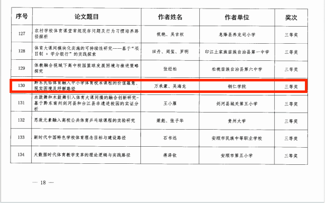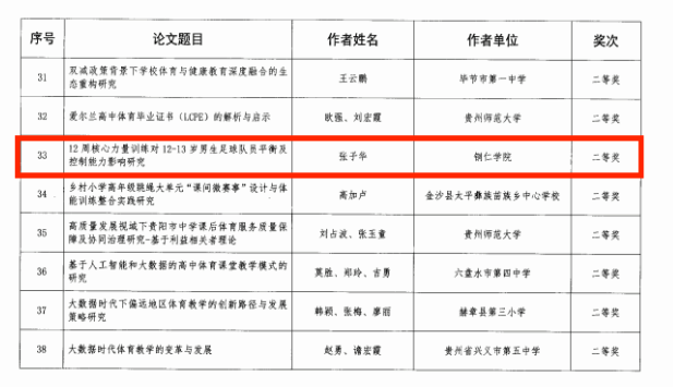 近日,在贵州省教育厅主办的全省第六届学生运动会科学论文报告会论文评选中,我院师生表现优异,共有4篇论文获得表彰。其中,王拱彪老师与李双孟、吴海龙老与张妮的两篇论文双双荣获一等奖;张子华老师的个人论文获二等奖;吴海龙老师与万承蒙同学合作的论文获三等奖。