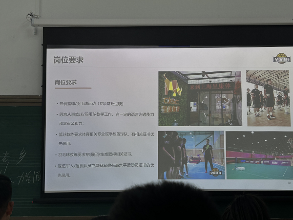 招聘会上,倪经理首先介绍了呈康体育的发展历史、公司规模和经营状况,并分析了国家体育产业的发展前景。他说,国人越来越重视身体健康,体育产业在未来有更广阔的发展空间。接着,倪经理介绍了公司的薪资待遇和福利,以及岗位要求。他鼓励同学们走出去,到一线城市寻求更大的发展空间,也表达了将会与大健康学院的优秀学子在铜仁合作开展培训机构的设想。