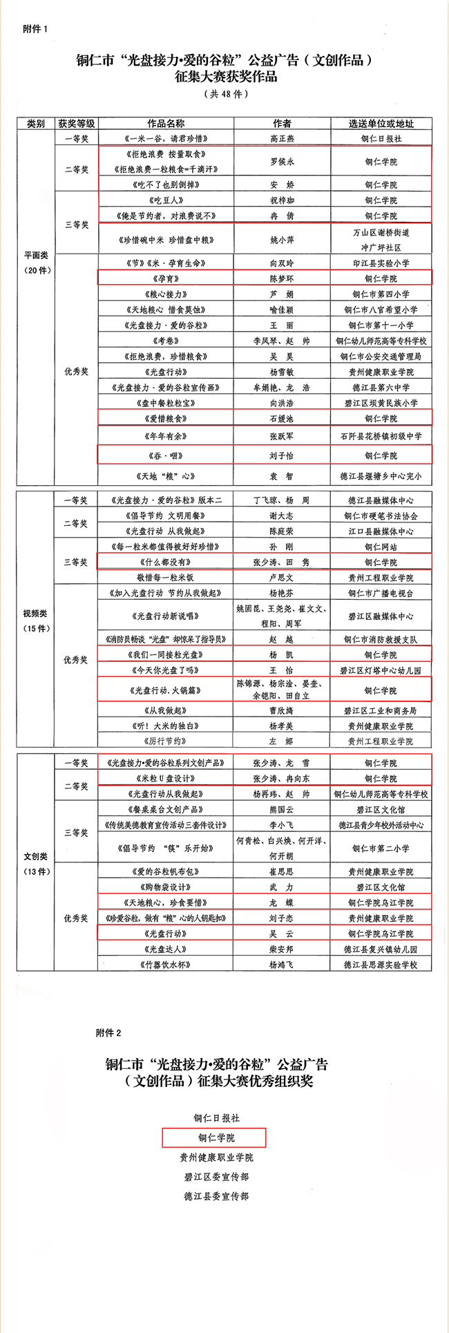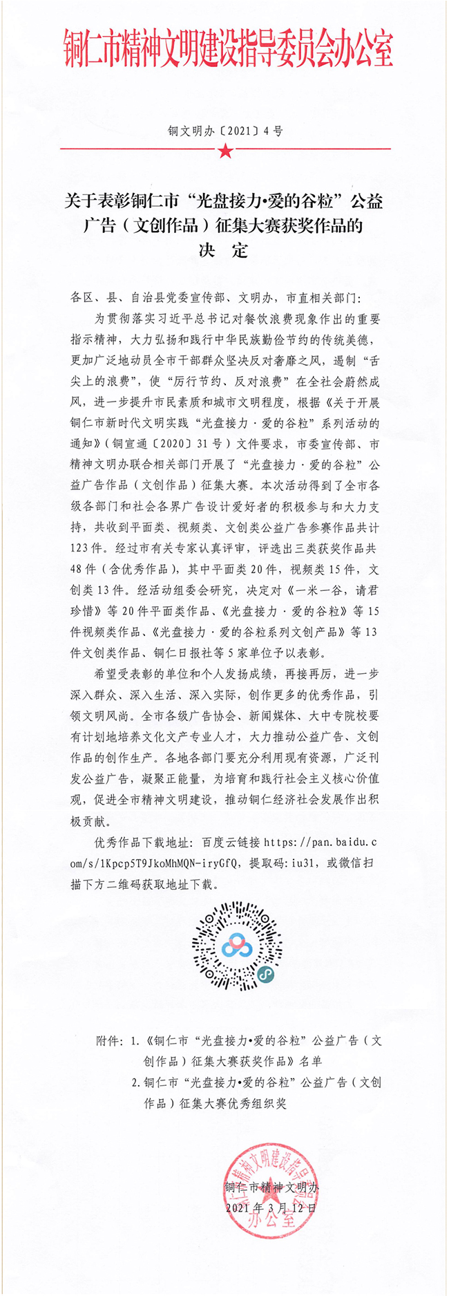 近日,由铜仁市委宣传部主办的“光盘接力·爱的谷粒”公益广告大赛公布获奖名单,共48件作品和5个单位获奖。其中,beat365官网14件作品在文创类、平面类、视频类均有获奖;beat365官网还荣获“优秀组织单位”。