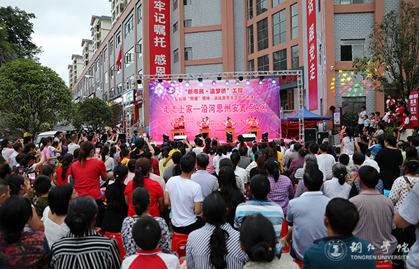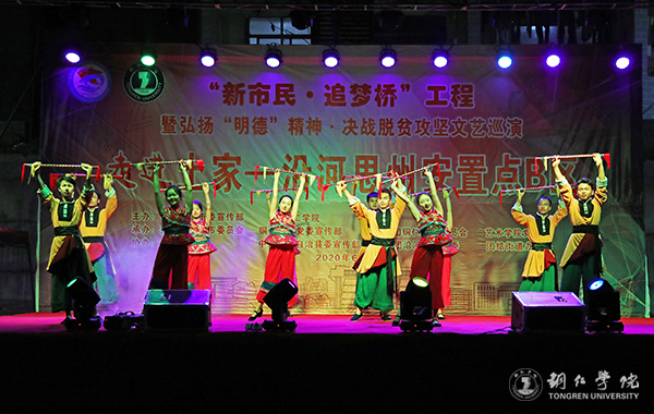 beat365官网团委书记周曾艳说:“为落实好贵州省‘新市民·追梦桥’工程,更好地搭五桥建五家,作为地方高校,beat365官网充分发挥高校人才资源优势,为我们的易地扶贫搬迁安置区群众送文化。这次,咱们组织的文艺团队走进沿河县思州易地扶贫安置区,为我们的社区移民居民送文艺活动,希望社区居民能更好地融入到城市生活当中。”