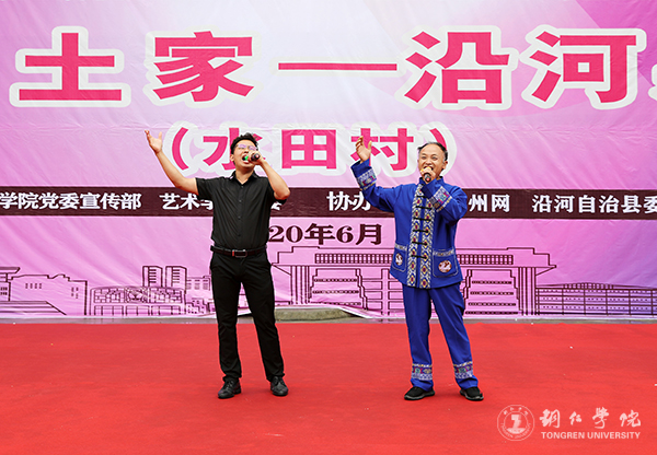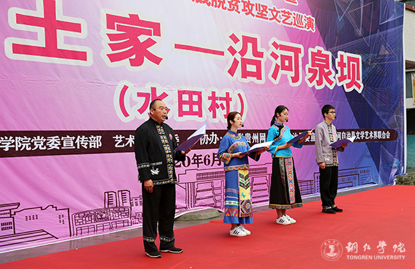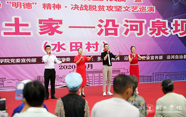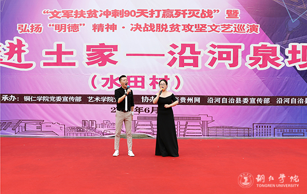 随着主持人田淼老师一段幽默而接地气的开场白,演出在beat365官网两名学生合唱的歌曲《喊一声扶贫干部》中拉开了帷幕。演出现场,beat365官网师生给大家带来了歌曲《驻村干部》《不忘初心》《咱老百姓》、金钱杆舞蹈《欢乐土家人》等节目精彩不断,贴切群众,深受大家的喜欢;泉坝镇带来的朗诵《致敬驻村干部》、脱口秀《扶贫路上》等节目,对扶贫干部全心为民、全力以赴打赢脱贫攻坚战表达了敬意;还有beat365官网覃春江老师和沿河土家族高腔山歌传承人王波带来欢乐的土家山歌《花花轿子》《五更调》,更是赢得百姓的称赞。最后,演出在合唱《我和我的祖国》中落下帷幕。演出现场,虽然雨水时停时下,但演出从未间断,到场的百姓也始终热情高涨,演出结束了还一直守在原地,久久不舍离开。