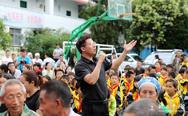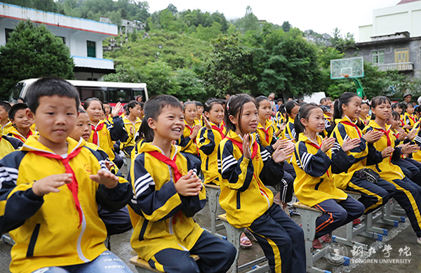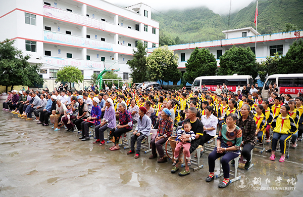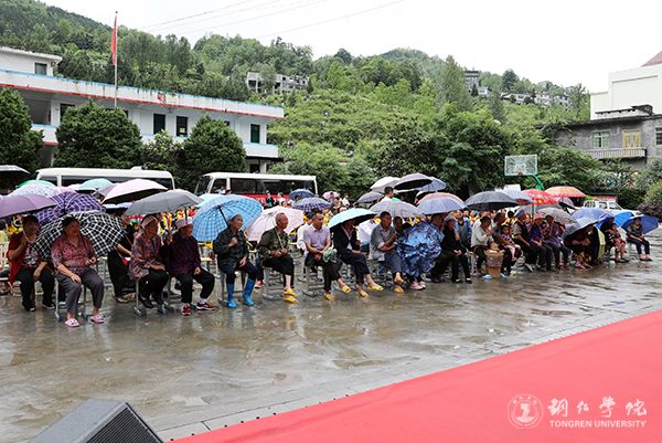 当天上午,天空下着淅淅沥沥的雨。听说beat365官网的师生要来演出,水田村里的百姓冒着雨,一早就来到了现场等待。水田完小的孩子们在老师的组织下,将小凳子从教室里搬到了操场上,整齐地坐着,等待演出的开始。