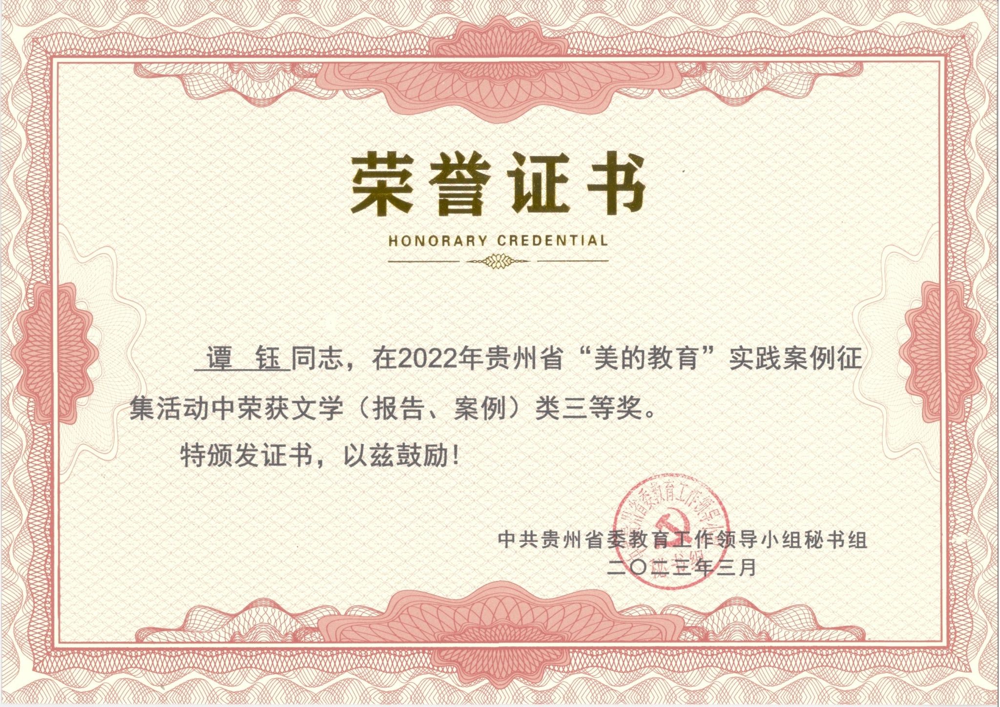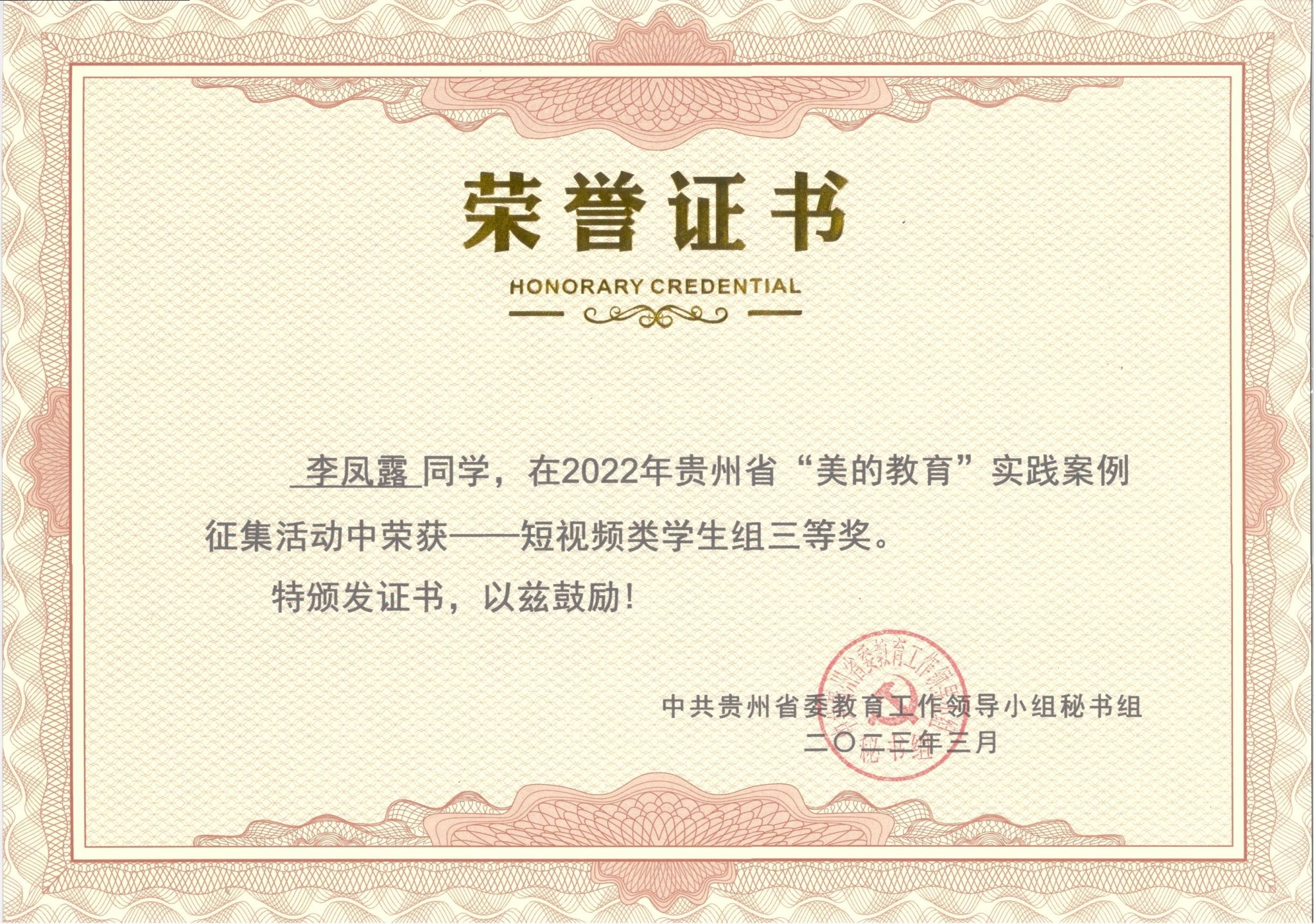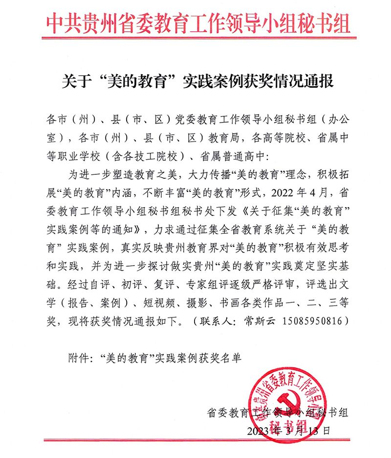 近日,中共贵州省委教育工作领导小组秘书组下发了《关于“美的教育”实践案例获奖情况通报》,此次全省获奖单位共80个,获奖作品共94件。beat365官网有4件作品获奖,获奖数量在所有参选单位中位居前列。