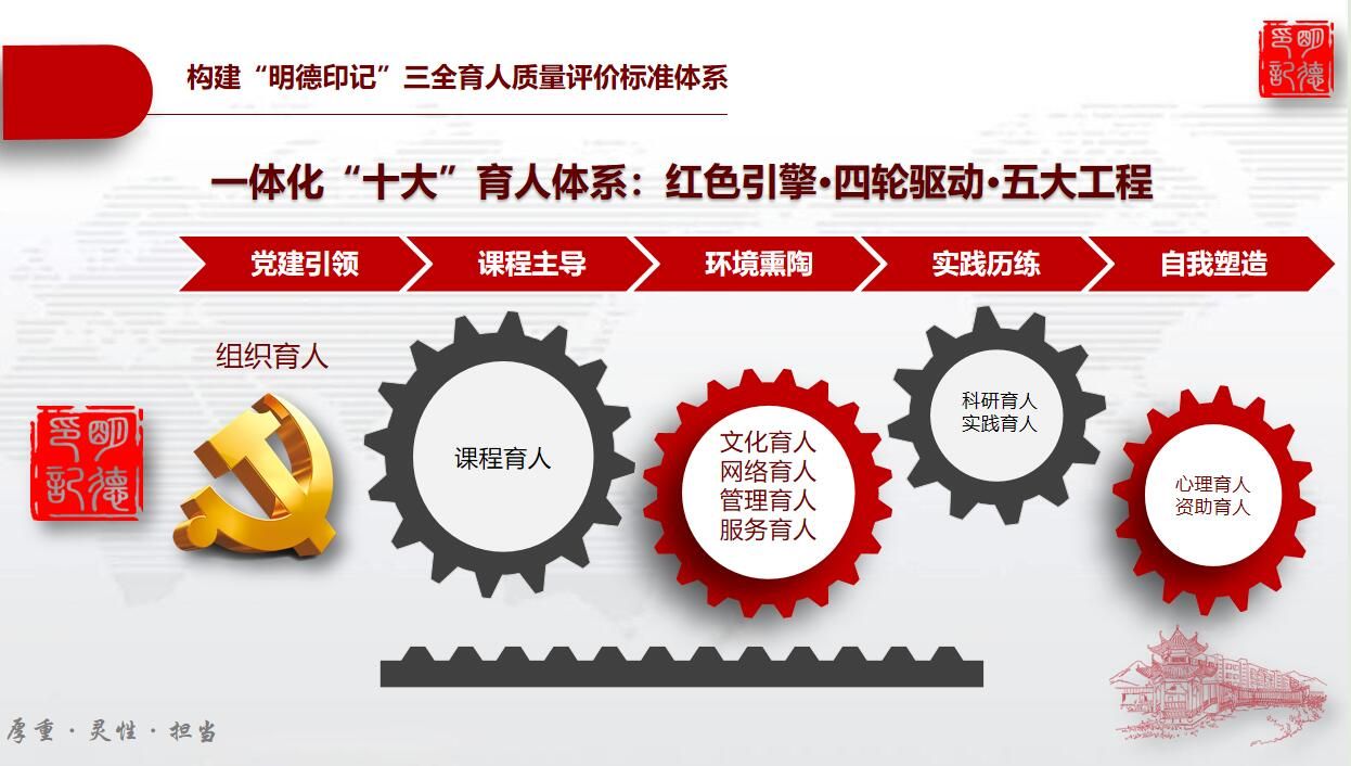 beat365官网深入学习贯彻落实习近平总书记关于高校思想政治工作重要讲话精神,贯彻落实中共中央、国务院《关于新时代加强和改进思想政治工作的意见》,中共中央办公厅、国务院办公厅印发的《关于深化新时代学校思想政治理论课改革创新的若干意见》、中共中央办公厅《关于加强新时代马克思主义学院建设的意见》和教育部等十部门关于印发《全面推进“大思政课”建设的工作方案》精神,把立德树人的根本要求内化为办学治校的具体措施,创新构建、夯实筑牢具有学校特色的“明德印记”思政工作体系,统揽办学治校、教育教学,深入实施党建引领、课程主导、环境熏陶、实践历练、自我塑造“红色引擎·四轮驱动”三全育人工程,深入推进课程、科研、实践、文化、网络、心理、管理、服务、资助、组织等十大育人,涵养、发展、锤炼师生“厚重·灵性·担当”的大山品格,落实立德树人根本任务,着力培养德智体美劳全面发展的社会主义建设者和接班人。