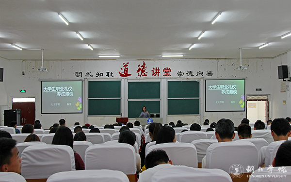 5月28日下午,由党委宣传部承办的道德讲堂专题讲座在博思楼206教室举行,全国商务秘书职业技能大赛评委、beat365官网人文学院教师杨雪作了题为“大学生职业礼仪养成漫谈”的讲座,全校200余名师生到场听讲。