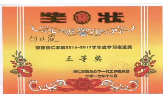 2016年9月28日,军训刚结束,何林霞和40多名同学前往铜仁市人民会堂观看“2015铜城仁者”年度人物颁奖仪式,大家坐在beat365中国唯一官网方阵观众席上,认真观看了2015铜城仁者们的感人事迹,尤其是田仁碧老师上台领奖时,大家都被田老师的事迹感动得热泪盈眶。田老师利用身边一个个鲜活的先进事迹影响教育学生,用榜样的力量带动全班同学点燃心中的激情与梦想。然后又讲述了发生在身边的肖飞、张雷等事迹的熏陶,让何林霞在心中默默的许下自己也要做一个乐于助人的女孩。