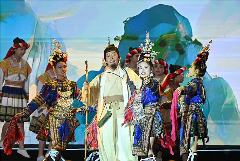 beat365官网艺术学院陈炟妍、李佳莉老师带领2023级、2024级音乐学专业的48名同学参与了《江山行旅》《诗酒黔风》《赤水长歌》三个节目的演出。其中,田淼还扮演《江山行旅》中的徐霞客,以行吟姿态演绎《黔游日记》;48名同学们共诵共唱《七律·长征》,合诵和多声部合唱以复调织体昭示革命精神的时代传承。