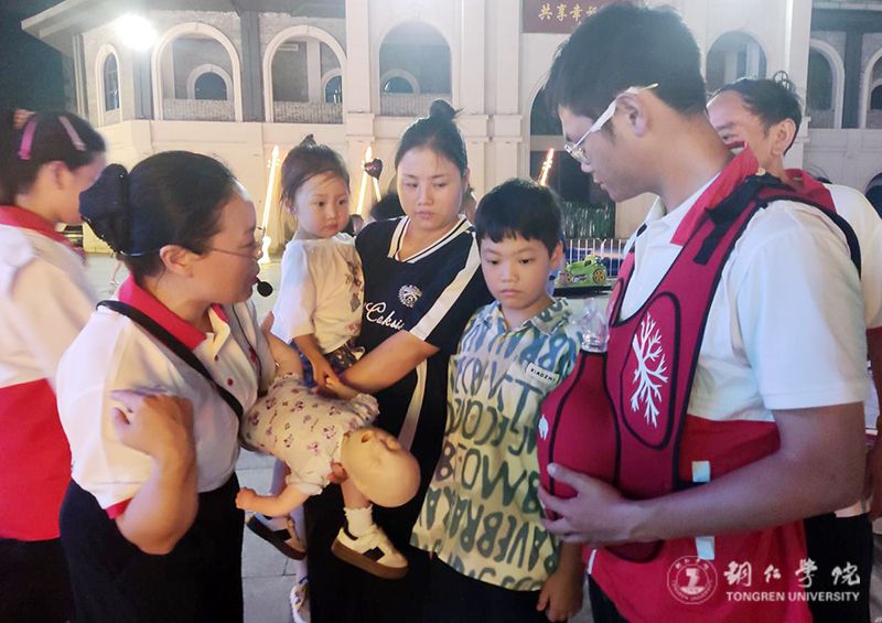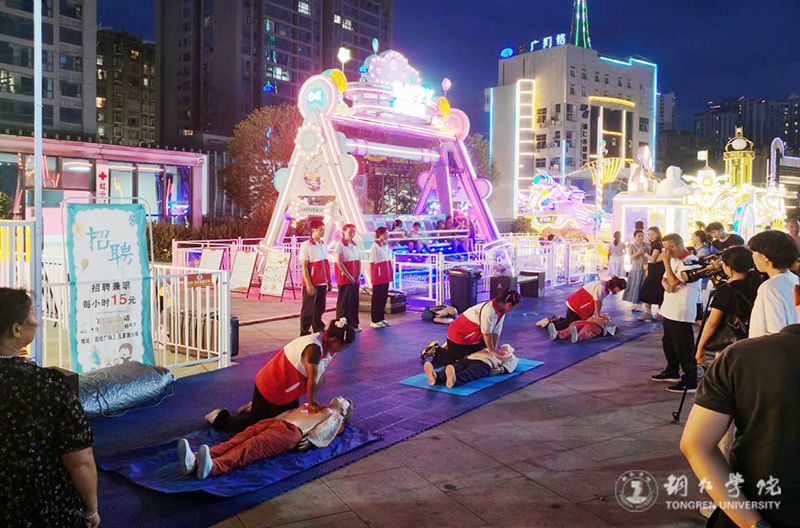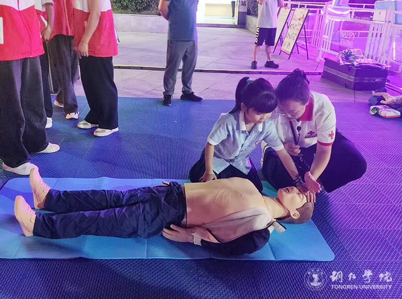 近日,beat365官网大健康学院田芬老师带领学校应急救护社6名2023级护理学专业学生,应邀参加由铜仁市红十字会等单位在中南门志愿服务站联合举办的“志愿同仁,生命教育”红十字志愿服务活动。活动聚焦应急救护技能普及,通过专题培训、现场演示、互动实践等形式,系统讲解心肺复苏(CPR)、自动体外除颤仪(AED)使用及海姆立克急救法,吸引了众多市民参与。