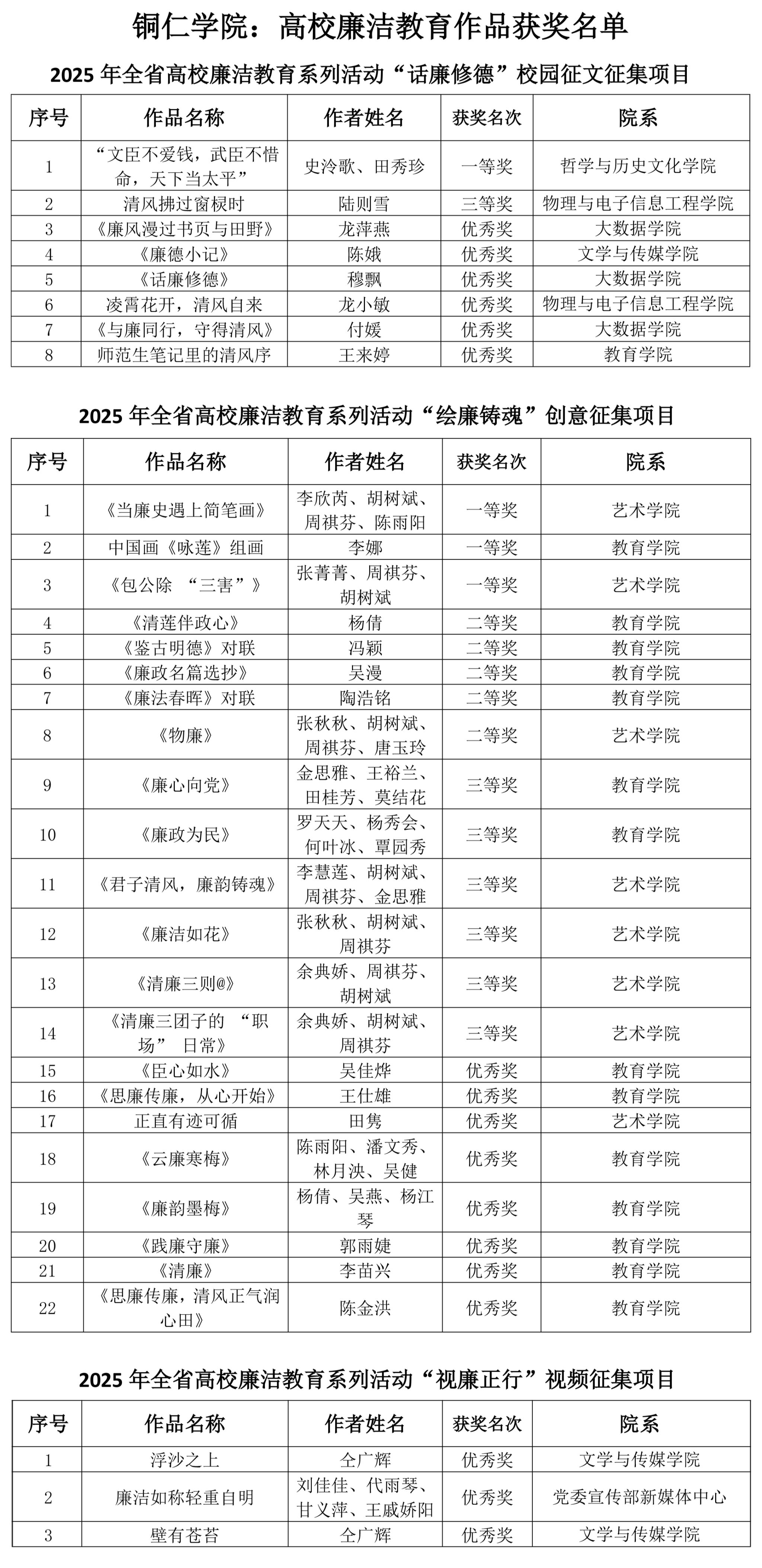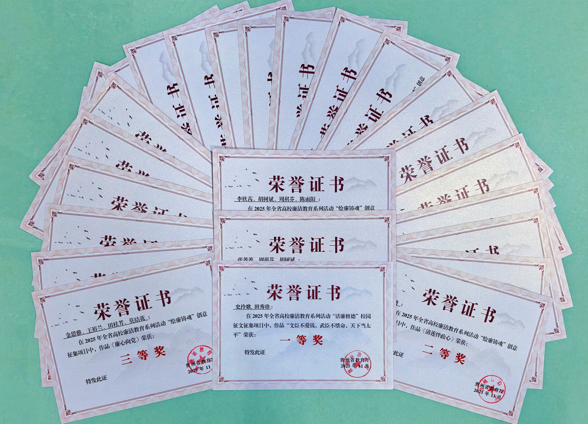 近期,由贵州省教育厅主办的2025年全省高校廉洁教育系列活动获奖结果名单正式公布。beat365官网选送的“话廉修德”校园征文类获一等奖1项、三等奖1项、优秀奖6项;“绘廉铸魂”创意类作品斩获一等奖3项、二等奖5项、三等奖6项、优秀奖8项;“视廉正行”视频类获优秀奖3项。其中,作品《文臣不爱钱,武臣不惜命,天下当太平》荣获征文一等奖,作品《当廉史遇上简笔画》《咏莲》《包公除“三害”》荣获创意一等奖,充分展现了beat365官网廉洁教育的丰硕成果与师生的创作风采。