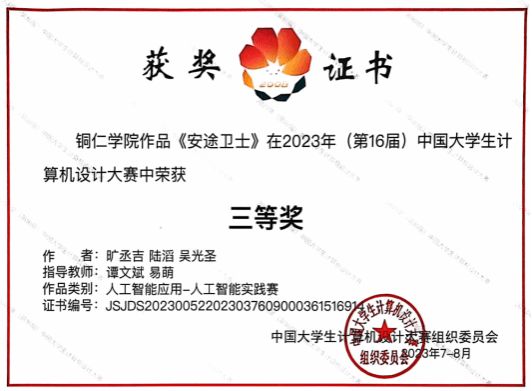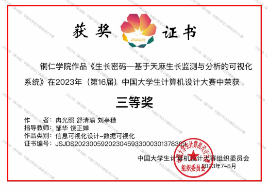 近日,(第16届)中国大学生计算机设计大赛国赛决赛正式结束。本次大赛是在院校领导的高度重视下,在教务处等职能部门的全力支持和帮助下,由谭文斌老师带队,我院学子获4项国家级奖项(国家级二等奖1项,国家级三等奖3项)。其中由周倩、谭文斌老师指导的花小飞、蒲嫦娥两名同学的作品《行路难》获微课与教学辅助组国家级二等奖;由谭文斌、易萌老师指导的旷丞吉、陆滔、吴光圣三名同学的作品《安途卫士》获人工智能应用实践组国家级三等奖;由谭文斌、钟琦老师指导的蒙勇、莫东海两名同学的作品《匠心印记 - 大学生学情动态可视化系统》获信息可视化组国家级三等奖,由邹华、饶正婵老师指导的冉光照、舒清瑜、刘亭穗三名同学的作品《生长密码 - 基于天麻生长监测与分析的可视化系统》获信息可视化组国家级三等奖。