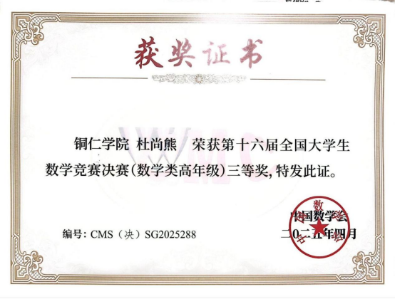 2025年4月13日,第十六届全国大学生数学竞赛决赛结果揭晓。我院2021级数学与应用数学专业杜尚熊同学荣获数学专业(高年级组)全国三等奖成为全国少数入围决赛并获奖的地方院校学生之一。