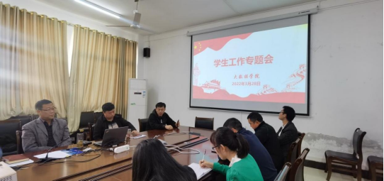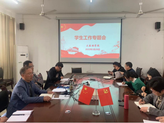 为了进一步加强疫情防控管理常态化下的学生教育与管理工作,充分发挥班主任作用,我院于2022年3月28日在大数据学院会议室开展了学生工作专题会。会议由院党委副书记安勐主持,书记李锦江、院长颜宝平、正处级专职组织员徐永东、副院长毛志、冉茂武、黄贻望以及18—21级全体班主任参加。
