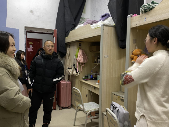 开学伊始,为及时地了解我院学生生活状况、思想动态及学业问题,确保学生管理工作有序、平稳开展,助推平安校园建设。2月25日晚7:30,大数据学院党委书记颜宝平、院长毛志、党委副书记安勐,学生科科长易萌及部分班主任辅导员一行走访学生寝室。