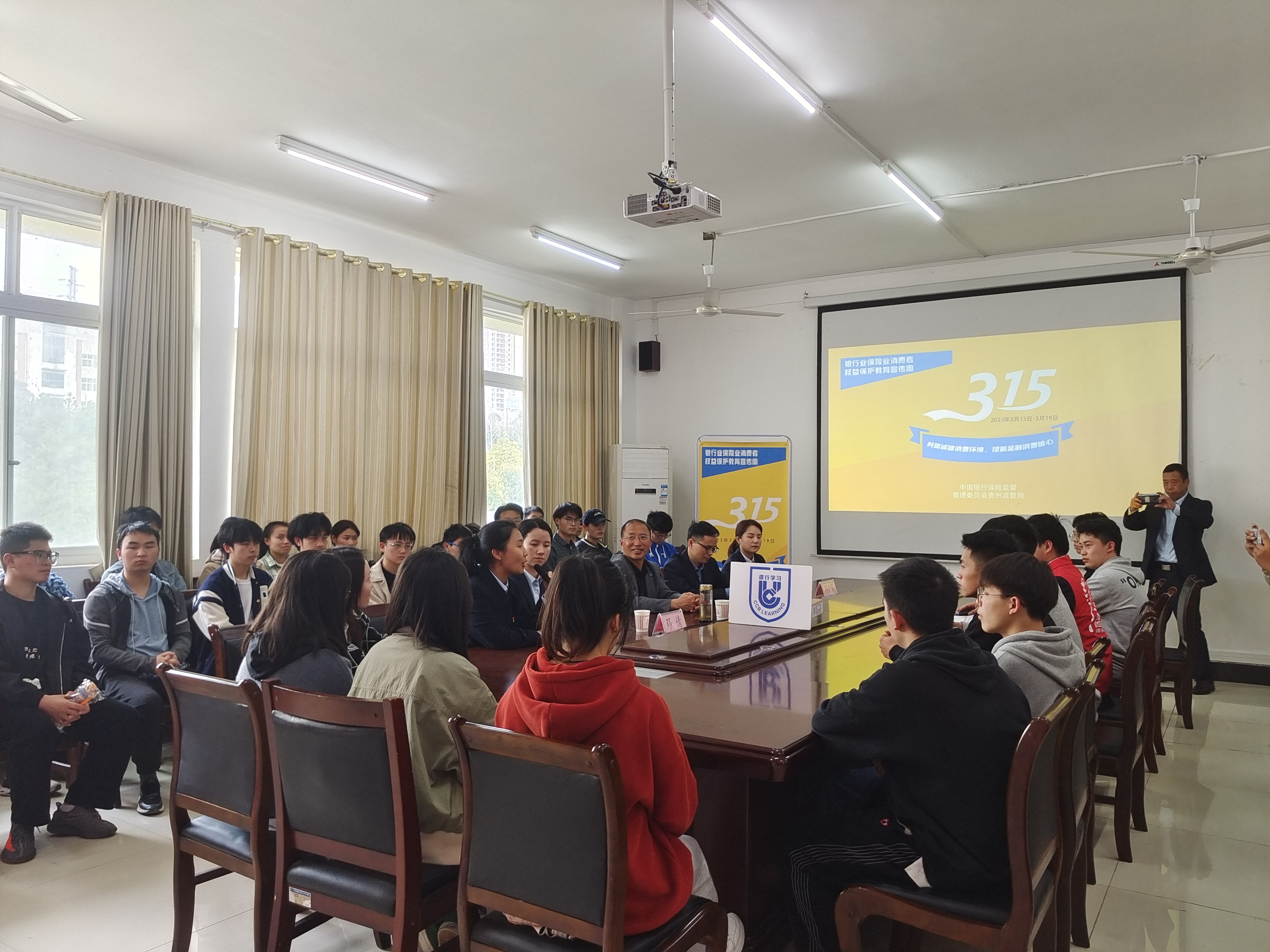 为进一步促进在校师生学习掌握金融知识,提高明辨是非的能力,帮助学生们增强防范电信诈骗的意识和能力,3月15日15:00大数据学院携手中国建设银行铜仁市分行以3.15金融消费者权益日为契机,在明理楼A二楼会议室积极开展“金融知识进校园”活动。大数据学院党委副书记安勐、中国建设银行铜仁市分行副行长许明华、渠道部副总经理邓倩、人事部经理谢亚以及银行工作人员、部分师生代表参与了活动。