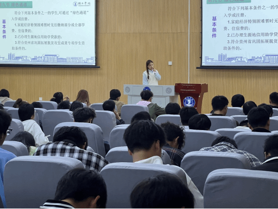 讲座伊始大数据学院资助宣传大使罗琳幽分别从“奖”“助”“贷”“勤”“补”“免”六个方面详细介绍了家庭经济困难学生认定、国家奖学金、国家励志奖学金、国家助学金、专业奖学金、贵州省巩固拓展脱贫攻坚成果专项学生资助、服兵役高等学校学生国家教育资助、临时困难补助、学费减免、生源地信用助学贷款、勤工助学、绿色通道、省属普通高校基层就业学费补偿国家助学贷款代偿等项目的申请条件、申请流程以及注意事项,她讲到国家和学校资助政策设立的原因和意义在于“不让任何一个学生因家庭经济困难而失学”。她引导同学们要常怀感恩之心,诚信做人,牢记国家的资助、社会的帮助,自强自立,在国家、社会、学校的帮助下努力学习,提高自身综合素养,回报国家,回报社会,成为一个德智体美劳全面发展的社会主义建设者和接班人。