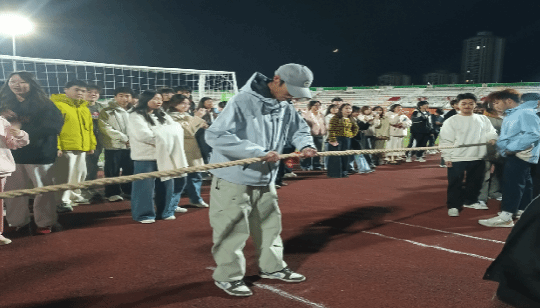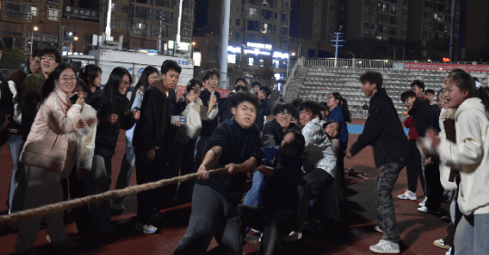 随着一声清脆哨响,拔河角逐正式开启。赛场上,队员们个个精神抖擞,双手紧握长绳,双脚稳稳扎根地面,身体后倾形成坚韧防线。“一二!一二!”的口号声铿锵有力,回荡在夜空之中,成为凝聚力量的最强节拍。绳中间的红线在两队间反复拉锯,每一次移位都牵动着全场目光,紧张激烈的对抗让观赛师生的呐喊声此起彼伏。