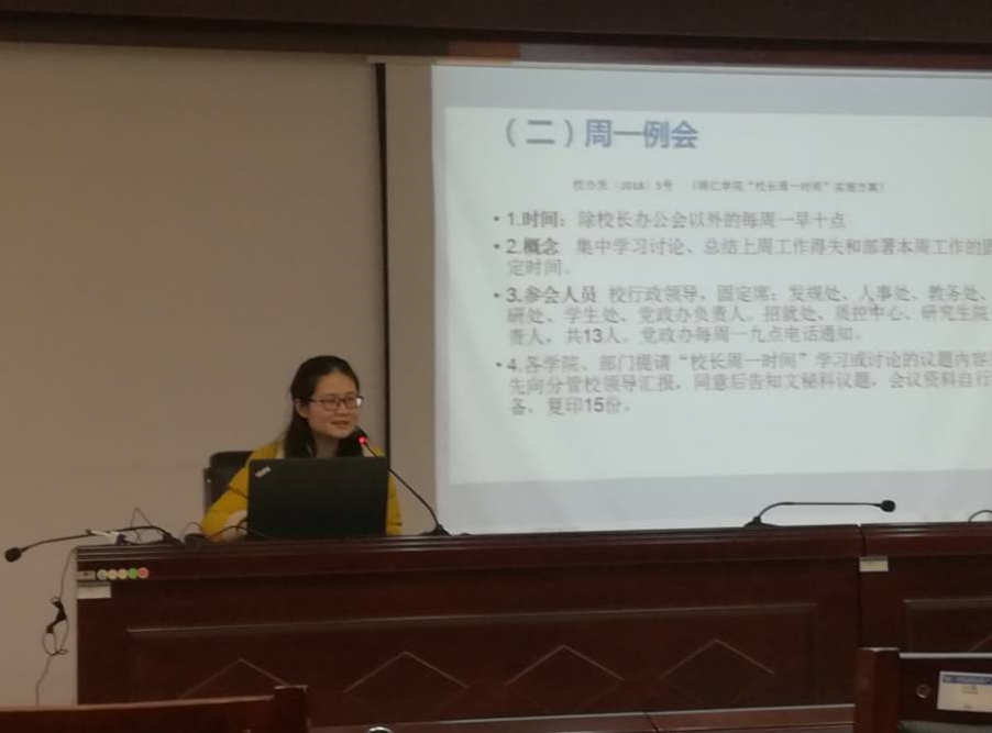 党政办综合科科长杨雷霄就会务安排、印章管理、来文处理等做了详细讲解,文秘科樊向国和向菲分别介绍了校内发文相关流程和校长周一例会等会议流程及定期报送总结相关事宜,事务科赵薇就公务接待做了详细介绍。