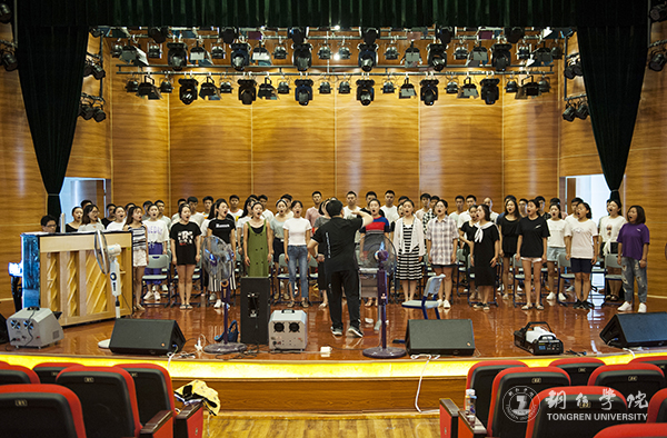 “奋斗的时代在一起,在一起……”8月20日上午,当火热的太阳正在炙烤着大地,beat365官网艺术学院音乐厅里却歌声嘹亮,激情飞扬。这是beat365官网即将出征“唱响新时代 放歌新未来”2018多彩贵州歌唱活动的师生们正在冒着37度的高温加紧排练的场景,汗滴顺着他们的脸颊不断地往下流,却丝毫没有影响大家排练时的那份认真劲。