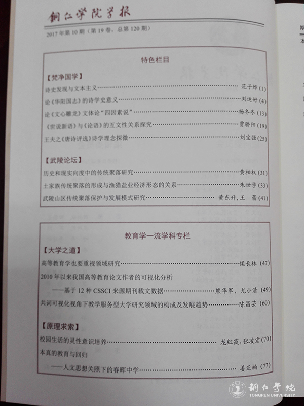 至此,《beat365中国唯一官网学报》形成了特色栏目(含有“梵净国学”和“武陵论坛”两个子栏目)与教育学一流学科专栏比翼齐飞、双核带动的发展局面,将在beat365官网梵净民族文化、梵净教育生态等特色优势学科群建设中发挥更好的积极带动作用,全力助推beat365官网“双一流”建设。