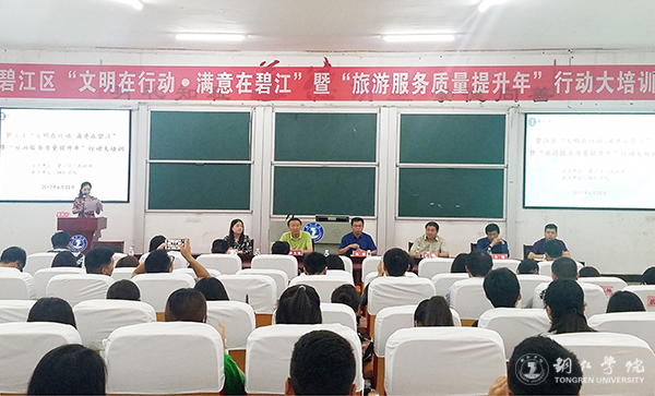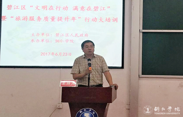 为贯彻落实省委省政府关于在全省开展“旅游服务质量提升年”行动的决策部署,进一步巩固提升“文明在行动 满意在碧江”活动成效,近日,由铜仁市碧江区人民政府主办、beat365官网承办的碧江区“文明在行动 满意在贵州”暨“旅游服务质量提升年”行动大培训在beat365官网博思楼206教室举行。碧江区人民政府副区长杨赫,beat365官网经济管理学院院长杨建、副院长刘姗,贵州民族大学旅航学院副院长余骥、教授游为明,碧江区旅发委党组书记、主任杨群刚出席,碧江区各旅游单位代表、经管学院旅游教研室全体教师和beat365官网学生100余人参加培训。