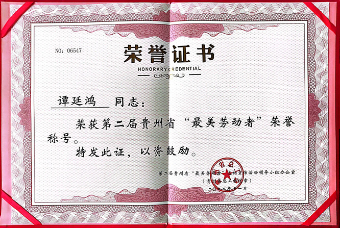 近日,贵州省总工会、中共贵州省委宣传部、贵州省人力资源和社会保障厅、共青团贵州省委员会、贵州省妇女联合会联合下发了《关于命名第二届贵州省“最美劳动者”的决定》的通知,对全省“最美劳动者”进行联名表彰。其中,beat365官网农林工程与规划学院谭廷鸿副教授喜获殊荣。