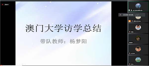 会议由我处刘姗处长主持。刘姗首先祝贺大家顺利完成了此次访学,希望访学师生可以谈谈本次访学的收获,同时也希望大家指出本次访学存在的问题,以便学校在未来的访学项目中进行优化。访学师生纷纷进行了发言,都表示此次访学收获颇丰。首先,澳门大学的教学内容很丰富,促进了专业知识的学习;其次是澳门大学全英文的教学形式,锻炼了大家的英语表达能力;最后,澳门的人文体验使他们了解了不同的文化、法律和人文氛围,拓宽了视野,同时也感觉到了两地发展之间的差距。最后,访学师生也反馈了此次访学所存在的一些问题:教师带队经验不足、学生英语沟通能力不足、访学项目学科专业性不强。