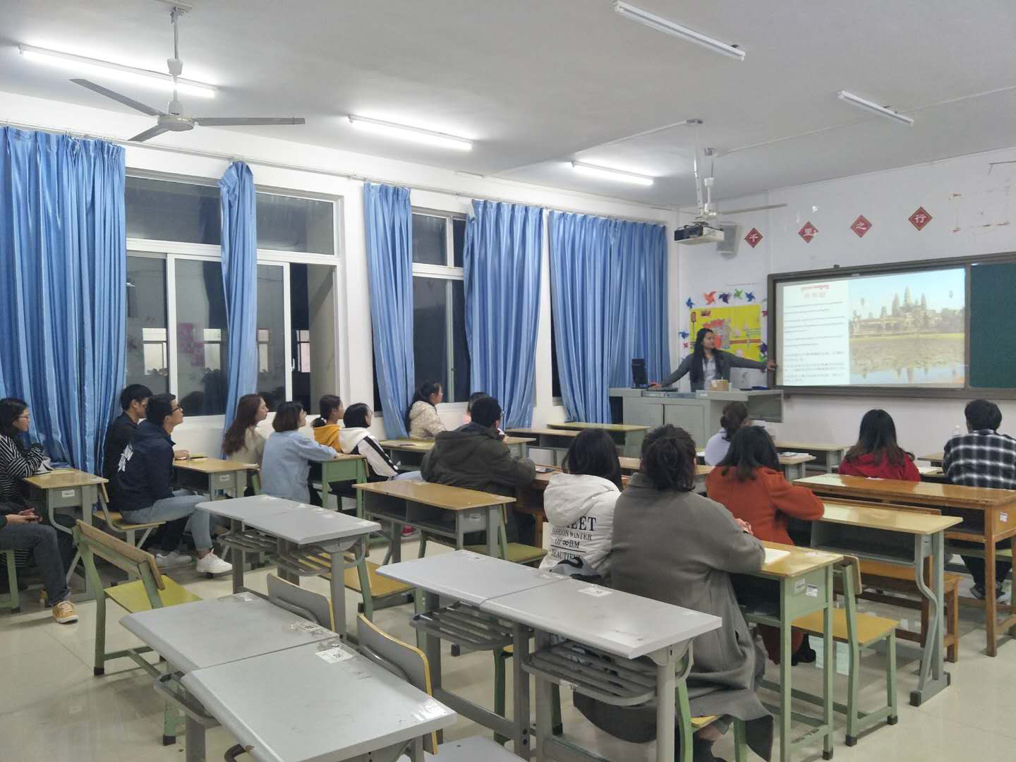 第一堂课,四位老师通过介绍本国的节日、建筑特点、美食等人文风情向大家展示了不一样的异国风情,同学们的积极性很高,互动性强。几位老师用PPT的方式教学,教老挝语27个字母拼音,形状各异,与汉语发音区别很大,但丝毫不影响同学们的学习热情。