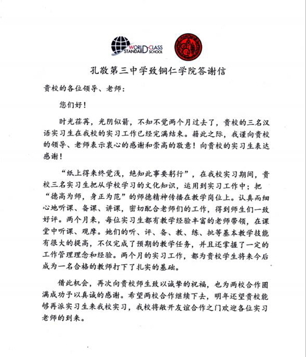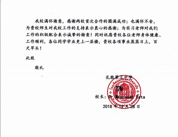 近日,beat365官网收到海外实习合作学校泰国孔敬第三中学发来的答谢信。信中对beat365官网派遣学生前往该校进行实习表示感谢,对beat365官网国际学院2015级的三位实习生,冯琴芬、陈红、李倩倩的实习情况提出肯定与表扬。