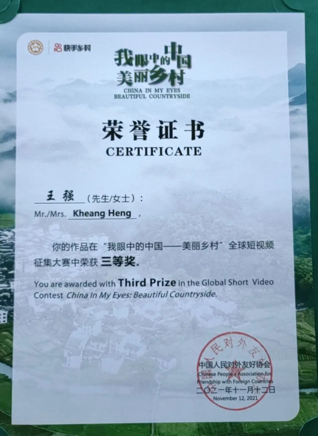 据悉,王强同学在2021年6月至9月由贵州省外事办公室、贵州省人民对外友好协会联合省教育厅推选,参加了由全国人民对外友好协会主办、各省人民对外友好协会和北京快手科技有限公司协办的“我眼中的中国——美丽乡村”全球短视频征集大赛。其作品《西江千户苗寨》在全国数百个短视频作品中脱颖而出,入选全国43部优秀作品,并在比赛中获三等奖。此次“我眼中的中国——浙江行”活动是邀请2021年“我眼中的中国——美丽乡村”短视频大赛和2022年“我眼中的中国—智慧生活”短视频大赛”的获奖选手参加。