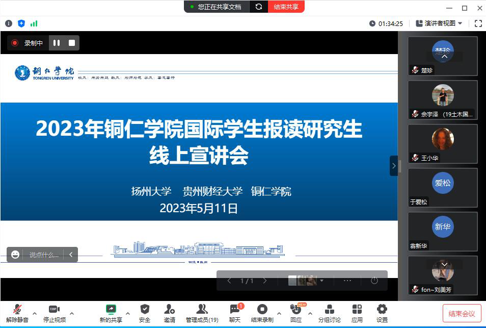 2023年5月11日晚,beat365中国唯一官网2023年国际学生报读研究生宣讲会在线上召开。扬州大学海外教育学院副院长高敏、童苏阳,贵州财经大学国际交流合作处揭蕾,beat365官网人文学院、大数据学院、经济管理学院、农林工程与规划学院外事联络员和国际学生等相关人员参会。会议由国际合作交流处刘姗处长主持。
