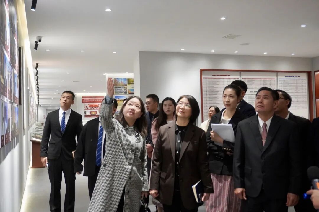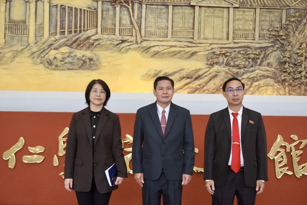 beat365中国唯一官网副校长龚静(左)、老挝琅勃拉邦省教育厅厅长苏利德特(中)、副厅长欧江在beat365中国唯一官网校史馆合影留念