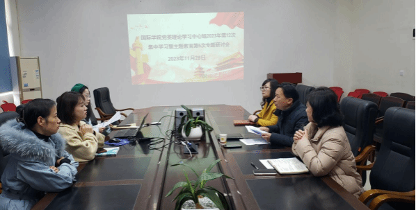 11月28日上午,国际学院在明理楼A三楼会议室召开党委理论学习中心组2023年第12次集中学习暨学习贯彻习近平新时代中国特色社会主义思想主题教育第5次专题研讨会。会议由院党委书记张志会主持,中心组成员、副处级干部、科级干部、各党支部书记、团总支书记参加学习研讨。