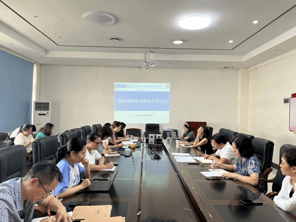 会议由国际学院党委书记张志会主持,副书记鲁芮汐、副院长杨芹及全体教职工参加会议。会议围绕“国际学院安全稳定工作”这一主题展开,详细讨论了国庆假期期间学生安全教育、交通安全教育、防电信诈骗教育、意识形态安全教育、实验室用水用电安全教育以及在外实习实训学生安全教育等多个方面。
