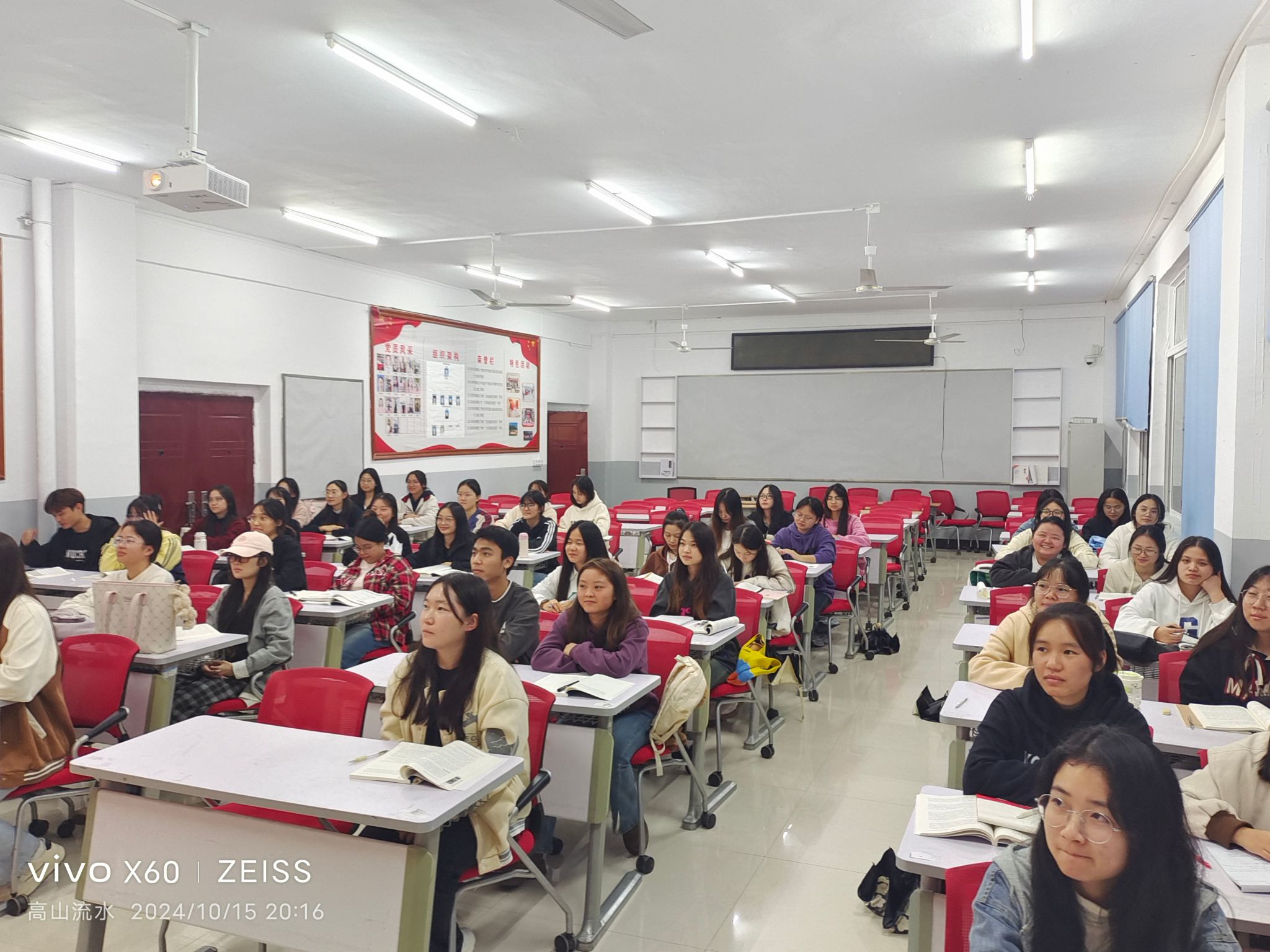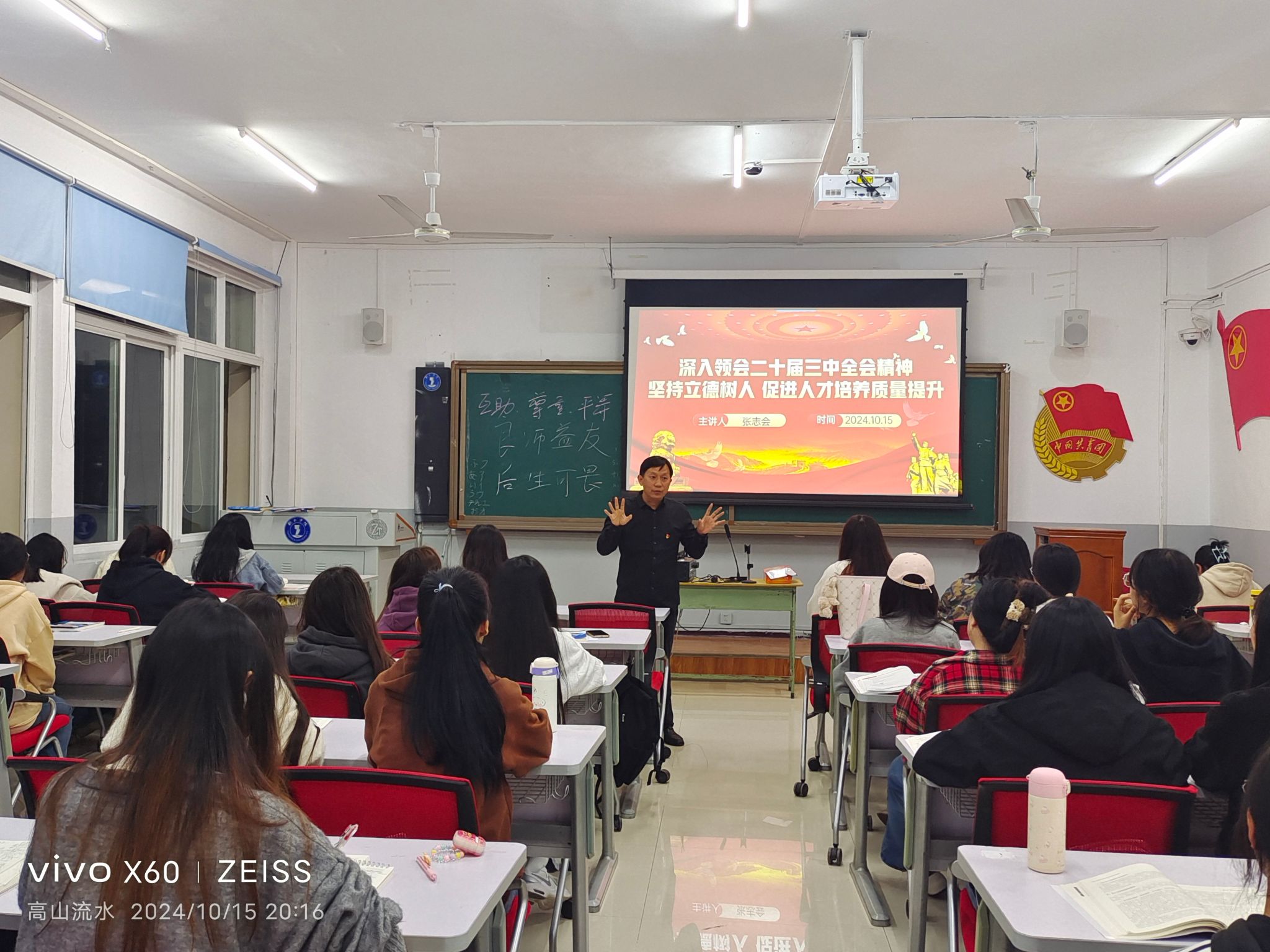 10月15日,院党委书记张志会在明理A401教室为2023级师范英语专业学生宣讲党的二十届三中全会精神。